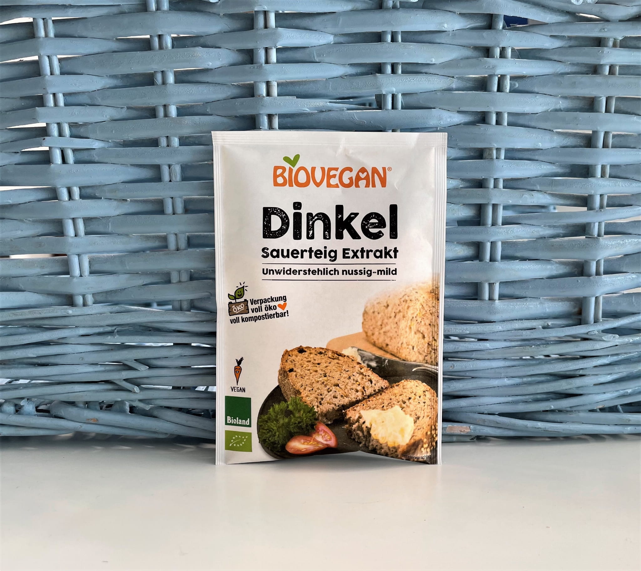 Przygotowanie: 1 saszetka zakwasu chlebowego orkiszowego bio 30 g Biovegan, 700 g mąki orkiszowej, 300 g mąki żytniej, 2 saszetki drożdży suszonych bezglutenowych bio 9 g Biovegan, 2 łyżeczki soli, 750 ml letniej wody. Dokładnie wymieszać wszystkie suche składniki. Dodać wodę i dobrze wyrobić. Przykryć i odstawić na 2 godziny w ciepłe miejsce. Następniue zagnieść ponownie i umieścić w wysmarowanej formie do chleba. Umieścić w zimnym piecu wraz z miseczką wody. Piec w temperaturze 180-200 st. C przez ok 80 min. Pozostawić do wystygnięcia.